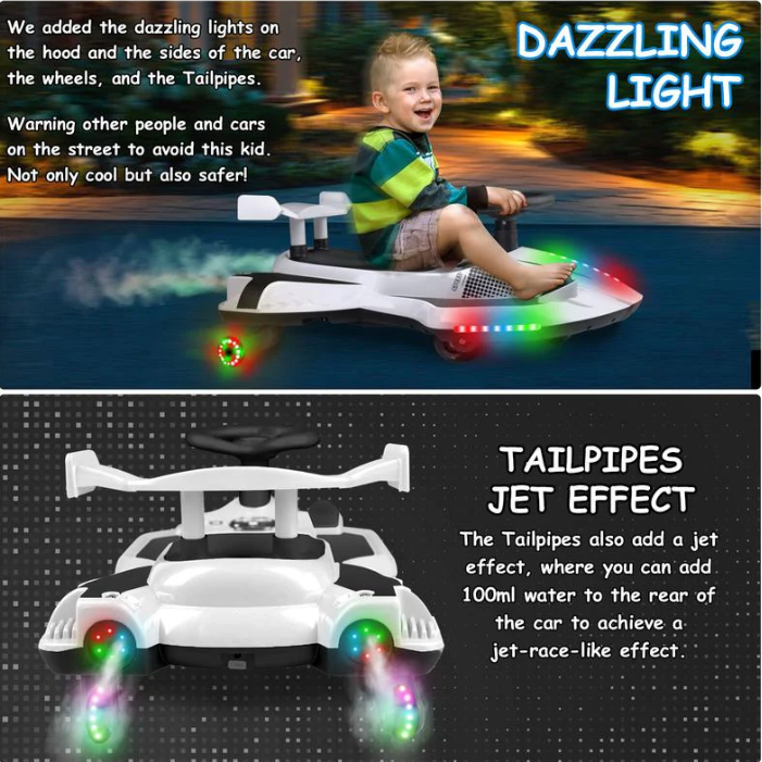 Get ready for a dazzling experience with our electric ride-on car! It features vibrant lights on the hood and wheels for a cool, safe ride. Plus, the tailpipes create a unique jet effect with a touch of water, making every drive feel like a high-speed race! 🚀