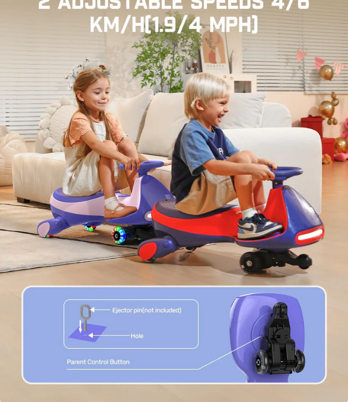 Get ready to race 😄🏁 with our electric wiggle cars 🏎️💨, featuring two adjustable speeds ⚡⚖️ (4/6 km/h or 1.9/4 mph) for safe, customizable fun 🎉🕹️. Parents 👨👩👧 can also control the speed with the press of a button 🔘🛡️, ensuring a secure and thrilling ride every time 🌟🚦.