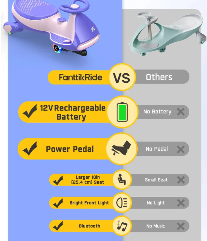 Discover the difference with FanttikRide 🚗💨! Unlike others, our wiggle car features a 12V rechargeable battery 🔋⚡, power pedal 🦶💨, larger seat 🪑✨, bright front lights 💡🌟, and Bluetooth music 🎵🎧 for a superior and exciting ride 😄🥳🌈.